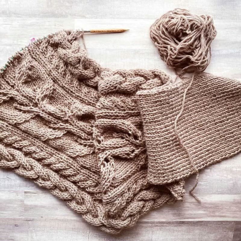 The sweater scarf with sleeves is knitted with two needles in an openwork pattern that simulates stitches and cables on the top and bottom, made of soft, durable and high-quality viscose knit.